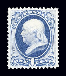 45 og 156 image#156, 1c Ultramarine, precisely centered mint single within large balance margins, fabulously fresh and bright, lovely fresh color and prooflike impression on immaculate paper, full clean o.g., lightly hinged, extremely fine; a surprisingly elusive stamp so choice; 1992 PF certificate. (Image) $300.00