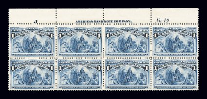 70 nhPB 230 image#230, 1c Columbian, pristine top margin letter "J", imprint and plate "No. 49" block of eight, incredibly fresh and bright, rich color and crisp impression, marvelously well centered throughout, o.g., never hinged, extremely fine; a very scarce plate block in this "post office" fresh and choice quality. (Image) $975.00