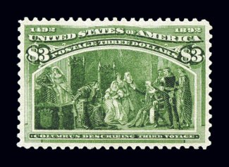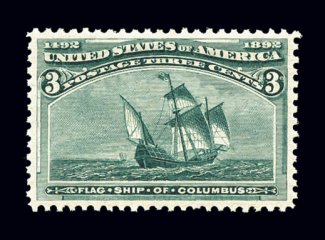 77 og 243 image#243, $3.00 Columbian, handsome mint single, with extraordinarily well balanced margins all around, rich fresh color, o.g., lightly hinged, extremely fine; a choice example; 1989 PF certificate. (Image) $1,900.00