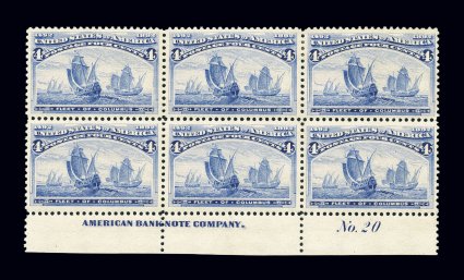 72 ogPB 233 image#233, 4c Columbian, bottom margin imprint and plate "No. 20" block of six, extraordinarily well centered, fresh color, o.g., lightly hinged, tiny thin speck in the top right stamp, otherwise very fine and handsome plate block. (Image) $1,050.00