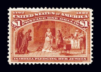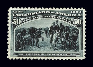 74 og 240 image#240, 50c Columbian, uncommonly well centered within large margins, deep luxuriant color and a highly detailed impression, o.g., lightly hinged, extremely fine. (Image) $600.00
