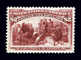 76 og 242 image#242, $2.00 Columbian, exceedingly well centered within exceptionally large margins, sumptuously rich color and a well incised impression, o.g., lightly hinged, extremely fine; a premium quality original gum Two Dollar Columbian; 1999 PF certificate. (Image) $1,250.00