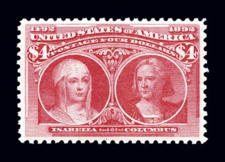 78 og 244 image#244, $4.00 Columbian, an extraordinarily fresh mint example, with gorgeous bright color and a crisp impression on pristine white paper, well centered within uncharacteristically large margins, clean o.g., very lightly hinged, extremely fine; a stamp with great visual appeal; 2006 PSE certificate (VF-XF 85; SMQ $3,550.00). (Image) $2,600.00