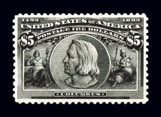 79 og 245 image#245, $5.00 Columbian, a highly desirable mint example of this popular high value commemorative, boasting excellent centering within large margins, strong rich color and a crisp detailed impression on bright white paper, o.g., lightly hinged, extremely fine; an especially handsome example; 1988 PF certificate. (Image) $3,000.00