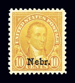 121 nh 679 image#679, 10c "Nebr." ovpt., a most impressive mint example of this key value to the Kans.-Nebr. overprints, featuring huge margins for this normally tightly-spaced stamp, exceedingly well centered as well, brilliant color, o.g., n.h., extremely fine; 1998 PF certificate. (Image) $230.00