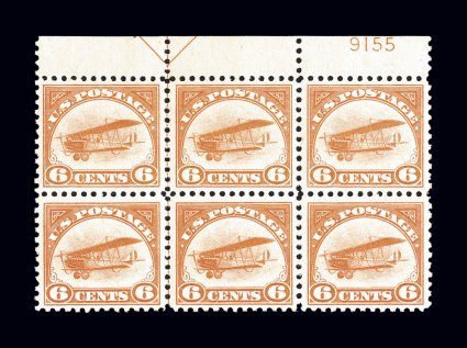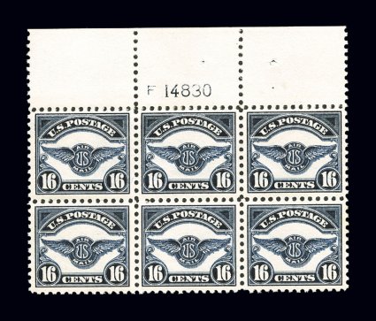 127 ogPB C5 image#C5, 16c Dark blue, attractive full top margin plate no. F 14830 block of six, deep intense color on bright white paper, well centered, crisp and intact, o.g., lightly hinged, bottom row never hinged, extremely fine; a select example of this scarce air post plate block. (Image) $1,550.00