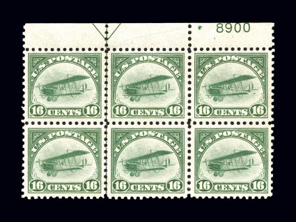124 ogPB C2 image#C2, 16c Green, top margin arrow and plate no. 8900 block of six, especially well centered, exceptionally fresh with lovely rich color on crisp white paper, o.g., lightly hinged in top selvage, stamps are never hinged though with natural gum skip in the top left stamp, extremely fine; a handsome plate block. (Image) $1,000.00