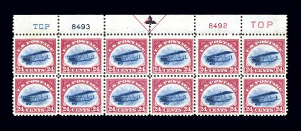 125 ogPB C3 image#C3, 24c Carmine rose and blue, top margin arrow and plate nos. 8493, 8492 block of twelve, unusually well centered, exceedingly fresh with strong bright colors on white paper, o.g., lightly hinged in the bottom right pair, other stamps are never hinged, two with natural gum skips, very fine-extremely fine and a handsome plate block. (Image) $1,225.00