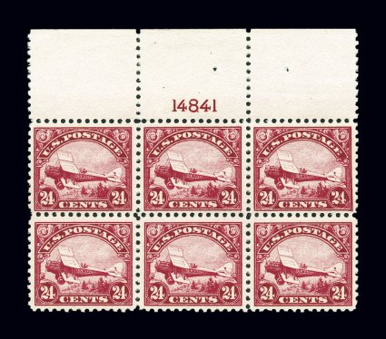 128 ogPB C6 image#C6, 24c Carmine, magnificent full top margin plate no. 14841 block of six, brilliantly fresh, stunningly rich color and impression on bright white paper, outstanding centering, o.g., very lightly hinged, an extremely fine plate block in every regard. (Image) $2,050.00