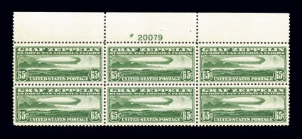 130 nhPB C13 image#C13, 65c Graf Zeppelin, an impressive full top margin plate no. F 20079 block of six, most striking is the extraordinary centering and margins that each of the stamps has, equally nice is its unusually intense deep color, o.g., n.h., natural flat plate gum bends, extremely fine; a lovely plate block with great eye appeal. (Image) $3,100.00