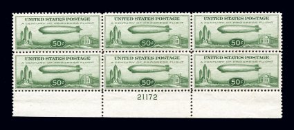 131 nhPB C18 image#C18, 50c Graf Zeppelin, full bottom margin plate no. 21172 block of six, brilliantly fresh, exceptionally well centered, each stamp with large even margins, o.g., n.h., natural gum skip in bottom row, extremely fine. (Image) $700.00