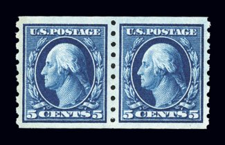 481 nh 396 image#396, 5c Blue coil, perf. 8 1/2 vert., pair, magnificently centered within uncharacteristically wide margins, deep luxuriant color and a strong detailed impression, pristine o.g., n.h., extremely fine; a gem coil pair; 1997 PF certificate and a 2006 PSE certificate (XF-Superb 95; SMQ $1,150.00); this is one of only three such pairs to have been graded XF-Superb 95 by the PSE, the highest grade awarded to date. (Image) $350.00