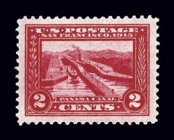 489 nh 402 image#402, 2c Panama-Pacific, perf. 10, an eye-catching mint example featuring huge jumbo margins, incredibly well centered within these impressive borders, full even perforations, bright carmine color, o.g., n.h., an extremely fine gem; seldom encountered in such outstanding condition; 1997 PF certificate and a 2006 PSE certificate (XF-Superb 95 Jumbo; SMQ $1,100.00 as 95 and $2,450.00 as 98). (Image) $175.00