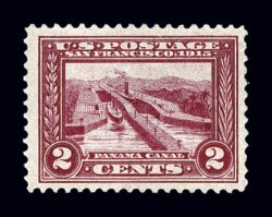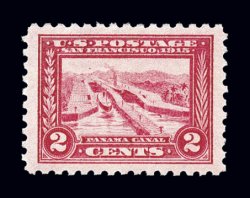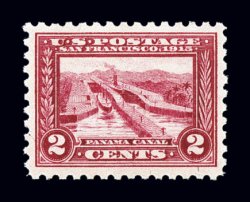 490 nh 402 var. image#402 var., 2c Panama-Pacific, perf. 10, a visually stunning mint example in the deep carmine shade as listed in Scott, this gorgeous color is incredibly intense and is somewhat akin to the lake shade found on its perforated 12 counterpart, brilliantly fresh and crisp, incredibly well centered and margined, pristine o.g., n.h., extremely fine; the first and only certified example of this distinctive shade variety we have ever seen; 1999 PF certificate and 2006 PSE certificates both specifically identifying this as the deep carmine shade (the latter grading XF 90; SMQ $375.00 as the more common normal shade). (Image) $175.00+