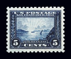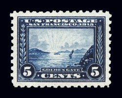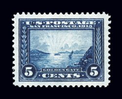 485 nh 399 image#399, 5c Panama-Pacific, a phenomenal quality mint example, being among the very few stamps of any series to have been awarded the ultimate grade of Gem 100 Jumbo by the PSE, as each and every aspect of this remarkable stamp is sheer perfection, with its mathematically precise centering amid absolutely enormous jumbo margins, prooflike color and impression on the freshest paper imaginable, unblemished o.g., n.h., superb; a stamp of breathtaking beauty whose equal simply does not exist; when a stamp of this quality is seen in person it is hard to imagine that anyone - collector or not - cannot appreciate the beauty and artistry of this country's remarkable philatelic artifacts; 1998 PF certificate and a 2006 PSE certificate (Gem 100 Jumbo; SMQ $2,050.00 as 98, as the SMQ does not attempt to price stamps of this quality). (Image) $180.00