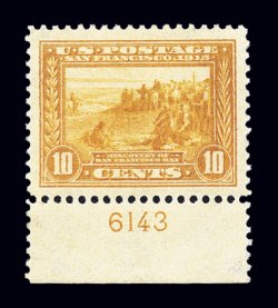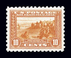 487 nh 400A image#400A, 10c Panama-Pacific, orange, gem mint single, possessing flawless centering amid extraordinarily large margins, gorgeous intense color and impression that is wonderfully contrasted by this stamp's especially bright white paper, pristine o.g. without a single gum bend or skip, n.h., extremely fine; a stamp for the perfectionist; 2002 PF certificate and a 2006 PSE certificate (XF-Superb 95; SMQ $2,200.00). (Image) $500.00