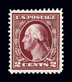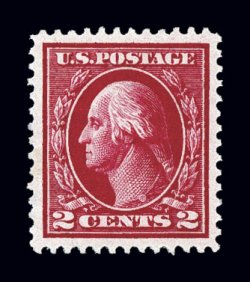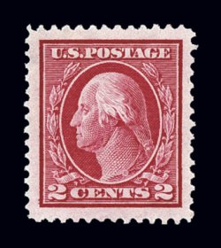 484 og 398b image#398b, 2c Panama-Pacific, lake shade, a handsome and remarkably choice mint example of this truly rare and distinctive shade variety, featuring rich unmistakable lake color and a strong impression, far better centered and margined than most existing examples, as nearly all are found quite off center to the right, o.g., lightly hinged, very fine; it is believed that only one sheet of this shade variety was printed, and few can compare in quality to the desirable copy offered here; 1994 and 2006 PSE certificates (the latter graded F-VF 75 - quite conservative given this is among the finest available; SMQ $1,500.00). (Image) $2,500.00