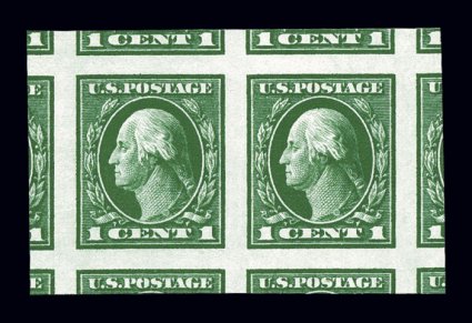 499 nh 408 image#408, 1c Green imperforate, gem mint horizontal pair, extracted from a sheet so that huge equal portions of all ten adjoining stamps appear, prooflike color and impression, o.g., n.h., superb. (Image) $4.20