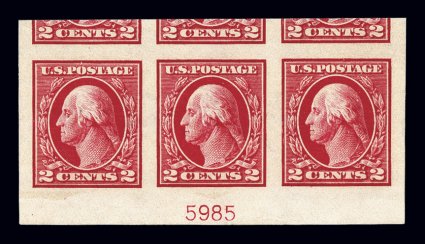 500 nh 409 image#409, 2c Carmine imperforate, striking bottom sheet-margin horizontal strip of three, with plate no. 5985 in sheet selvage, enormous margins all around, including showing large portions of three adjoining stamps at top, radiant color, o.g., n.h., superb. (Image) $7.40+