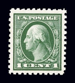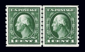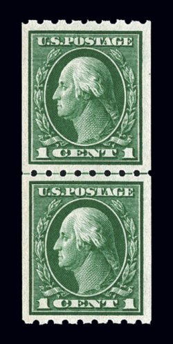 503 nh 412 image#412, 1c Green coil, perf. 8 1/2 vert., choice guide line pair, marvelously well centered within very large margins, deep luxuriant color, o.g., n.h., extremely fine; a line pair that is almost never encountered in this gem quality; 1985 and 1997 PF certificates, as well as a 2006 PSE certificate (XF 90; SMQ $550.00). (Image) $260.00