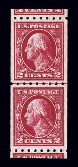 502 nh 411 image#411, 2c Carmine coil, Ty. I, perf. 8 1/2 horiz., highly select guide line pair, cut from a strip so that equal portions of the adjoining stamps appear at top and at bottom, virtually perfectly centered within large margins, intense radiant color and a crisp impression, o.g., n.h., extremely fine gem; actually quite elusive in this outstanding condition; 1998 PF certificate and a 2006 PSE certificate (XF-Superb 95; SMQ $440.00). (Image) $125.00
