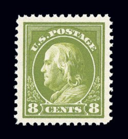 504 nh 414 image#414, 8c Pale olive green, a fabulous mint example in the finest condition imaginable, perfectly centered amid extravagantly large margins, wonderfully rich color and a strong impression on wonderfully fresh paper, uniformly even and intact perforations all around, pristine o.g., n.h., a superb gem in every regard; the epitome of perfection; 1993 PF certificate and a 2006 PSE certificate (Superb 98 Jumbo; SMQ $1,800.00 as 98); the highest graded awarded to a Scott #414 by the PSE, as well as being the sole example in this remarkable grade; ex-Pietsch. (Image) $100.00