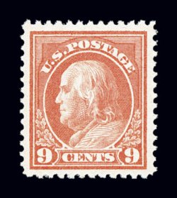505 nh 415 image#415, 9c Salmon red, marvelously bright and fresh, with uncommonly strong color, large balanced margins, o.g., n.h., extremely fine gem; 1990 PF certificate and a 2006 PSE certificate (XF-Superb 95; SMQ $1,000.00); the XF-Superb 95 grade is the highest assigned to date for any Scott #415; ex-Morris. (Image) $120.00