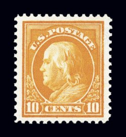 506 nh 416 image#416, 10c Orange yellow, a particularly choice mint single, possessing exceptionally wide margins and being very well centered within these large borders, strong rich color on fresh white paper, o.g., n.h., an extremely fine gem; 1994 PF certificate, as well as 1988 and 2006 PSE certificates (the latter graded XF-Superb 95; SMQ $830.00). (Image) $100.00