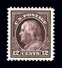 507 nh 417 image#417, 12c Claret brown, incredibly well centered amid huge margins unlike any other example we have encountered on this value, gorgeous rich color and impression on wonderfully fresh paper, immaculate o.g., n.h., an extremely fine gem; 1998 PF certificate and a 2006 PSE certificate (XF-Superb 95 Jumbo; SMQ $800.00 as 95 and $1,800.00 as 98); ex-Pietsch. (Image) $110.00
