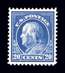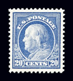 509 nh 419 image#419, 20c Ultramarine, a highly desirable mint example, possessing an exceptional overall freshness, with beautiful rich color and a sharp impression on bright white paper, marvelously well centered within lavishly large and perfectly balanced margins, immaculate o.g., n.h., extremely fine; a most impressive gem; easily one of the very finest mint #419's we have ever seen; 2000 PF certificate for a block of four, this being the bottom right stamp, as well as a 2006 PF certificate for the single (the latter graded XF-Superb 95; SMQ $2,100.00). (Image) $425.00