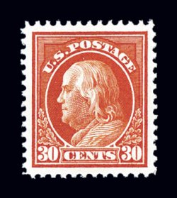 511 nh 420 image#420, 30c Orange red, outstanding centering within unusually wide margins, gorgeous color in an especially deep shade, razor-sharp impression on brilliantly white paper, pristine o.g., n.h., extremely fine; a gem stamp which possesses tremendous eye appeal; 1996 PF certificate and a 2006 PSE certificate (XF-Superb 95; SMQ $1,500.00); among the highest graded Scott #420's in the PSE population report, with only two copies grading higher. (Image) $260.00