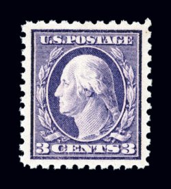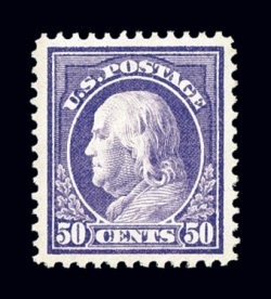 513 nh 422 image#422, 50c Violet, double line watermark, an exceptional mint example, possessing outstanding centering within extra-wide margins which are most uncommon to this value, rich luxuriant color and a strong impression, unblemished o.g., n.h., extremely fine; premium quality never hinged examples of #422 are exceedingly difficult to find; 2000 PF certificate and a 2006 PSE certificate (VF-XF 85; SMQ $890.00). (Image) $550.00
