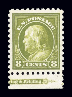 522 nh 431 image#431, 8c Pale olive green, handsome and choice bottom margin partial imprint single, exceptionally well centered and margined, sumptuously rich color, pristine o.g., n.h., extremely fine gem; 1991 and 2003 PF certificates, as well as a 2006 PSE certificate (XF-Superb 95; SMQ $760.00). (Image) $80.00