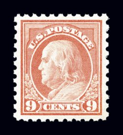 523 nh 432 image#432, 9c Salmon red, remarkably well centered within margins that are quite large for this value, bright vibrant color on fresh paper, even and intact perforations all around, o.g., n.h., extremely fine; seldom encountered in this gem never hinged condition; 1987 PF certificate and a 2006 PSE certificate (XF 90; SMQ $360.00); ex-Lessin. (Image) $105.00