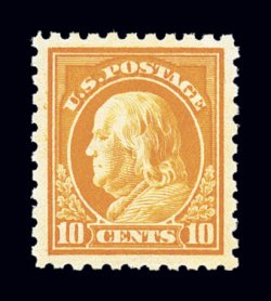 524 nh 433 image#433, 10c Orange yellow, an eye-arresting mint single, featuring the most dazzling color we have ever seen on this value, plus it features exceptionally large and perfectly balanced margins all around, immaculate o.g., n.h., an extremely fine gem; 2002 PF certificate for a block of five from which this stamp was taken, as well as a 2005 PSE certificate for the single (XF-Superb 95; SMQ $890.00); ex-Cohen. (Image) $105.00
