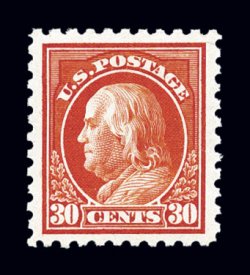 530 nh 439 image#439, 30c Orange red, fabulously fresh mint single, boasting incredibly intense color and a strong impression, wonderfully contrasted by its bright white paper, extraordinarily well centered amid lavishly large margins, pristine o.g., n.h., extremely fine and handsome; 1996 PF certificate and a 2006 PSE certificate (XF 90; SMQ $1,400.00). (Image) $575.00
