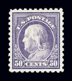 531 nh 440 image#440, 50c Violet, an exciting mint single that is, without question, among the finest never hinged examples of this scarce value we have ever offered in our auctions, incredibly well centered amid large margins, sumptuously rich color and a strong impression on fresh paper, fully intact and even perforations all around which is a seldom seen occurrence on any perf. 10 issue, unblemished o.g., n.h., an extremely fine gem for the finest collection of never hinged stamps; 2002 and 2006 PSE certificates (the latter graded XF-Superb 95; SMQ $5,400.00); among the highest graded n.h. examples in the PSE population report, with only one grading higher (98). (Image) $1,300.00