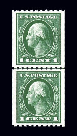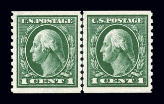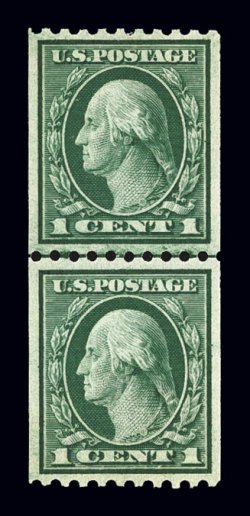 534 nh 443 image#443, 1c Green flat plate coil, perf. 10 vert., gem quality guide line pair, boasting outstanding centering and extraordinarily large margins for a flat plate coil, incredibly rich color and a crisp impression on bright paper, pristine o.g., n.h., extremely fine; a surprisingly difficult coil line pair to find in this premium condition; 1990 and 1998 PF certificates, as well as a 2006 PSE certificate (XF 90; SMQ $630.00). (Image) $325.00