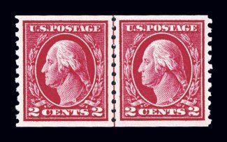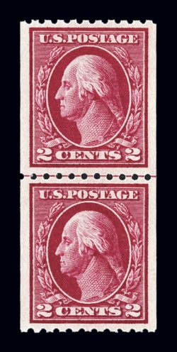 535 nh 444 image#444, 2c Carmine flat plate coil, perf. 10 vert., guide line pair, a matchless quality example of this very scarce and often faked coil line pair, possessing a spectacular overall freshness rarely encountered, with gorgeous intense color in a deep "fiery" shade, flawlessly centered within exceptionally large margins, even the guide line is perfectly positioned between the two stamps, pristine o.g., n.h., extremely fine; a gem line pair that is, in all likelihood, the finest in existence; 1993 PF certificate and a 2005 PSE certificate (XF-Superb 95; SMQ $2,150.00); not only is this the highest graded line pair in the PSE population report, this is the only example to have been assigned this impressive grade; ex-Cohen. (Image) $675.00