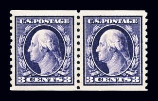 536 nh 445 image#445, 3c Violet flat plate coil, perf. 10 vert., a magnificent mint pair in the finest attainable quality, being fabulously well centered amid extravagantly large margins all around, its color is particularly eye-arresting as it is a striking intense shade, plus its impression is deeply etched on bright paper, pristine o.g., n.h., truly superb; a gem pair for the most fastidious collector; 1993 and 1997 PF certificates, as well as a 2006 PSE certificate (XF-Superb 95 Jumbo; SMQ $1,950.00 as 95 and $3,250.00 as 98); the only pair in the PSE population report to grade XF-Superb Jumbo, the highest grade assigned to date for any pair of Scott #445. (Image) $1,250.00
