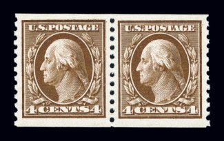 537 nh 446 image#446, 4c Brown flat plate coil, perf. 10 vert., pair, marvelously well centered within huge balanced margins, prooflike color and impression on fresh crisp paper, immaculate o.g., n.h., extremely fine; a particularly handsome and choice pair; 2001 PF certificate for a strip of five from which this pair was taken, as well as a 2006 PSE certificate for the pair (XF 90 Jumbo; SMQ $1,300.00 as 90 and $2,200.00 as 95). (Image) $700.00