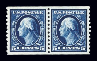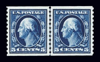 538 nh 447 image#447, 5c Blue flat plate coil, perf. 10 vert., pair, marvelously well centered, with both stamps possessing unusually wide margins all around, sumptuously rich color and a prooflike impression on pristine paper, immaculate o.g., n.h., extremely fine; a gem coil pair; 1997 PF certificate and a 2006 PSE certificate (XF-Superb 95; SMQ $760.00). (Image) $240.00