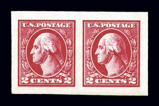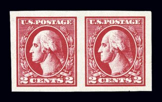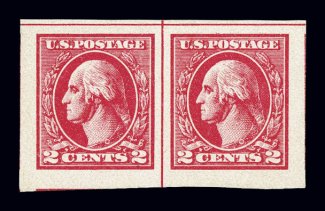 621 nh 533 image#533, 2c Carmine offset imperforate, Ty. V, a most impressive mint horizontal pair of this scarce stamp, featuring huge symmetrical margins all around, strikingly intense color and impression offset wonderfully by its bright white paper, pristine o.g., n.h., extremely fine gem; the finest quality pair of Scott #533 we have ever had the pleasure to offer; 1996 PF and 2006 PSE certificates. (Image) $230.00