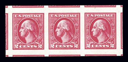 622 nh 534 image#534, 2c Carmine offset imperforate, Ty. Va, an eye-arresting mint horizontal strip of three, carefully extracted from a larger multiple so that large equal portions of all ten adjoining stamps appear, wonderfully "framing" the strip, radiant color and impression, pristine o.g., n.h., extremely fine gem; 2006 PSE certificate. (Image) $92.50