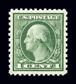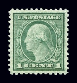 630 nh 542 image#542, 1c Green coil waste, perf. 10x11, a most remarkable quality mint example of this relatively common stamp in anything but common condition, possessing mathematically precise centering amid the most lavish margins we have ever seen on this stamp, plus its color and impression could not be more prooflike on pristine paper, o.g., n.h., extremely fine; the only example we have offered worthy of being described as superb; 1998 PF certificate and a 2006 PSE certificate (Superb 98; SMQ $570.00); the sole example to be awarded this lofty grade, this highest given for a Scott #542. (Image) $30.00