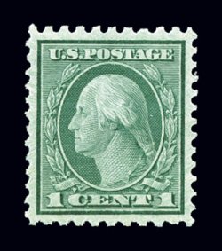 631 nh 545 image#545, 1c Green coil waste, perf. 11, an incomparable mint example of this challenging stamp, in fact we believe this to be the finest in existence, supported by the fact that the PSE has graded this stamp a remarkable Superb 98 Jumbo, sporting absolutely enormous margins which are almost unheard of on any of the coil waste issues, let alone this especially tightly margined stamp, absolutely perfectly centered within these lavish borders, brilliantly fresh as well, with bright rich color, unblemished o.g., n.h., superb; a true condition rarity in this gem condition; 1999 PF certificate and a 2006 PSE certificate (Superb 98 Jumbo; SMQ $6,200.00 as 98); the only example to have been given this remarkable grade, the highest awarded to any #545. (Image) $425.00