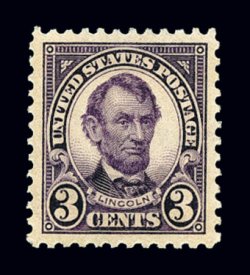 640 nh 555 image#555, 3c Violet, superb mint example, fabulously well centered within extravagantly large margins, prooflike color and impression, o.g., n.h., an extremely fine jumbo; 1998 PF certificate and a 2006 PSE certificate (Superb 98 Jumbo; SMQ $540.00 as 98); this is the highest grade awarded to Scott #555, and the sole example to achieve this impressive grade; ex-Pietsch. (Image) $37.50