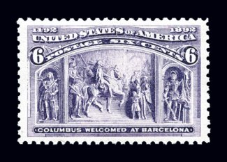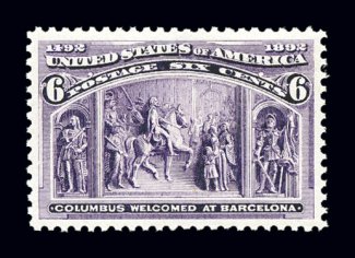 321 nh 235 image#235, 6c Columbian, a spectacular jumbo-margined mint example that ranks among the finest Six Cent Columbians in existence, possessing margins that are incredibly large and most uncharacteristic of this value, virtually perfectly centered within these impressive borders, brilliantly fresh and crisp, immaculate o.g. without a single gum bend or skip, n.h., a superb large-margined gem for the perfectionist; when this striking stamp last appeared at auction in our November 2000 Collector's Series Sale it realized a then record $2,420.00 (including premium), versus its $170.00 catalog value; 1999 PF certificate and a 2006 PSE certificate (XF 90 Jumbo - a grade that could easily be argued is entirely too conservative for this; SMQ $500.00 as 90 and $1,400.00 as 95); ex-Vreeland. (Image) $210.00
