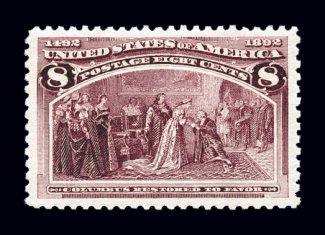323 nh 236 image#236, 8c Columbian, an exciting mint single of this value, which is notorious for being found very tightly margined, this particular example boasts margins that are completely out of the ordinary, as they are extravagantly large and perfectly balanced all around, rich luxuriant color and a sharp impression as well, immaculate o.g., n.h., extremely fine; the perfect stamp for the collector who has been patiently waiting for a true gem example of an Eight Cent Columbian; 1998 PF certificate and a 2006 PSE certificate (XF-Superb 95 Jumbo; SMQ $1,150.00 as 95 and $2,650.00 as 98); among the highest graded never hinged Eight Cent Columbians in the PSE population report, with only two other stamps grading higher. (Image) $220.00
