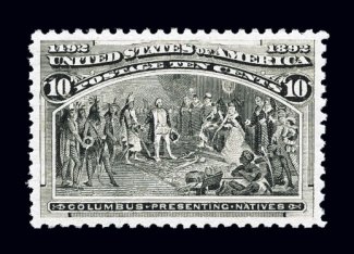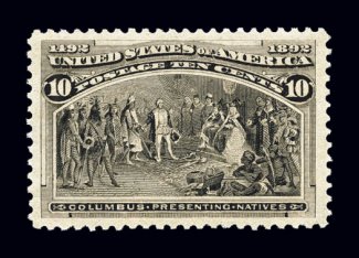 324 nh 237 image#237, 10c Columbian, flawlessly centered within exceptionally wide margins which are most uncommon to this value, intense color in the gray black shade which is actually more difficult to find than the black brown shade (see next lot) in premium condition, plus its impression could not be more deeply etched on pristine paper, immaculate o.g. without a single gum bend or skip, n.h., an extremely fine gem for the perfectionist; 2002 PF certificate and a 2006 PSE certificate specifically identifying this as the Gray black shade (XF-Superb 95; SMQ $2,150.00). (Image) $350.00
